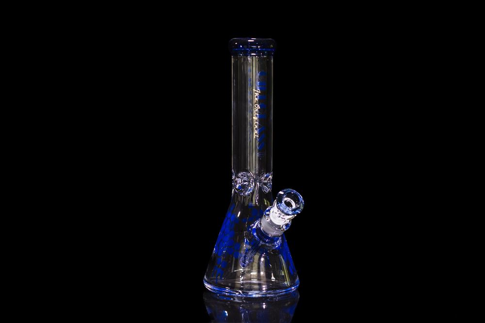 This hefty beaker bong from Gili Glass is all function, no frills (aside from the sleek honeycomb pattern, of course). Super thick 9mm borosilicate glass provides amazing durability, well as a substantial weight to this piece. Even the bowl piece itself is thick and sturdy, featuring thick glass and a pinched design. The wide chamber makes this bong perfect for big hits, with a 6-slit diffused downstem to effectively purify and cool down smoke. Further chill your smoke by packing the wide neck with ice over the low-set pinch. The clarity of the glass is complimented perfectly by matching color accents. It is 12 inch tall.